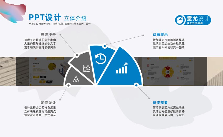 蘇州意尤文化傳播有限公司是一家有著多年廣告設(shè)計經(jīng)驗(yàn)的蘇州知名廣告企業(yè) 主要業(yè)務(wù)有蘇州PPT設(shè)計、蘇州產(chǎn)品PPT設(shè)計、蘇州企業(yè)PPT設(shè)計、蘇州會議PPT設(shè)計、蘇州項(xiàng)目PPT設(shè)計、企業(yè)VI設(shè)計、設(shè)計印刷宣傳冊/樣本/單頁/名片等 自2007年成立以來,蘇州意尤廣告公司與蘇州及蘇州各市的幾百家中外企業(yè)進(jìn)行了廣告設(shè)計合作,經(jīng)過多年發(fā)展公司已形成了以企業(yè)PPT設(shè)計、企業(yè)VI設(shè)計,廣告設(shè)計,廣告印刷,樣本設(shè)計,宣傳冊設(shè)計,名片印刷,菜譜制作,單頁,宣傳單等一批特長業(yè)務(wù),相信在各位新老客戶的關(guān)心下,本公司會得到更大的發(fā)展,同時為客戶的發(fā)展宣傳保駕護(hù)航。